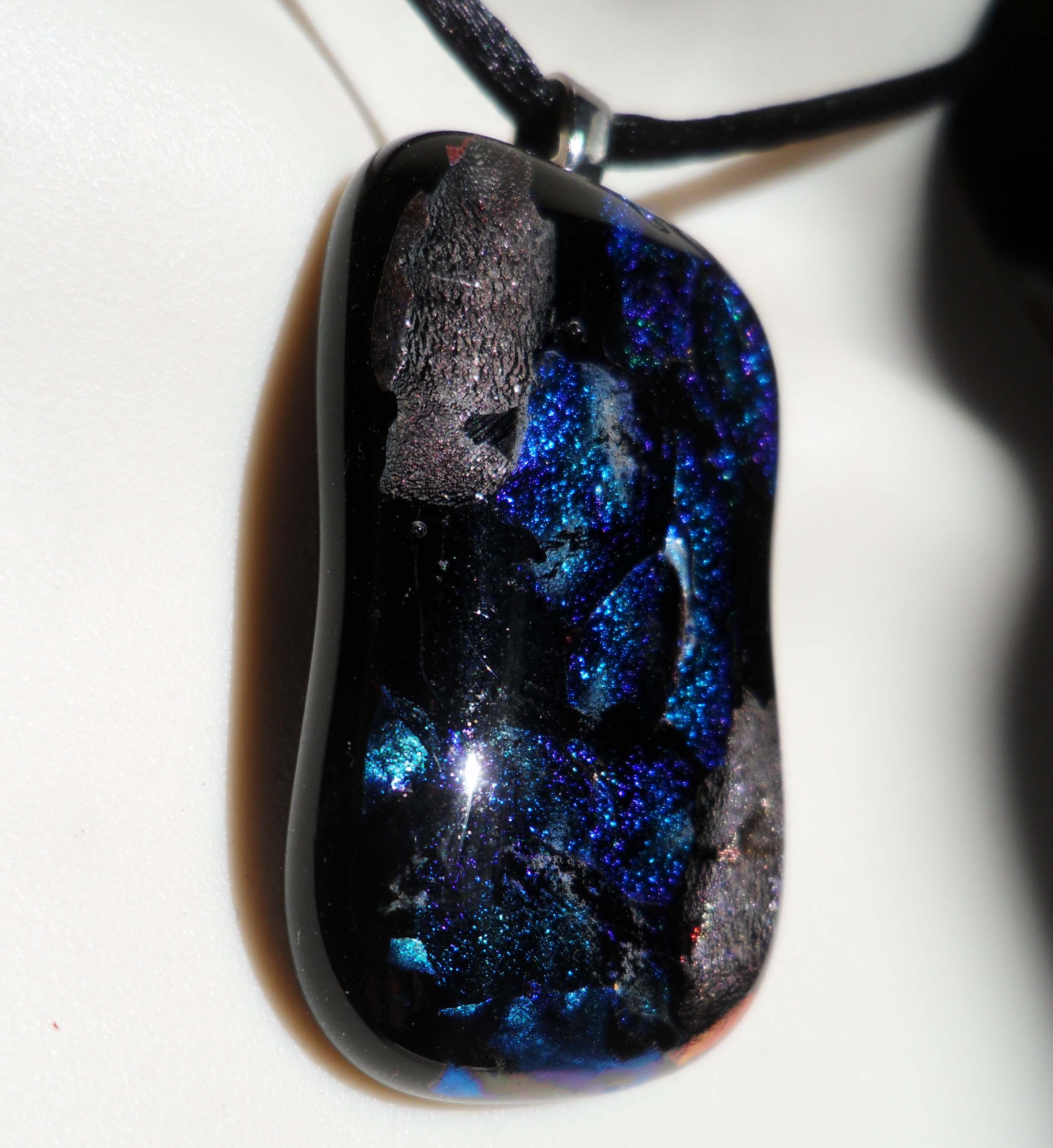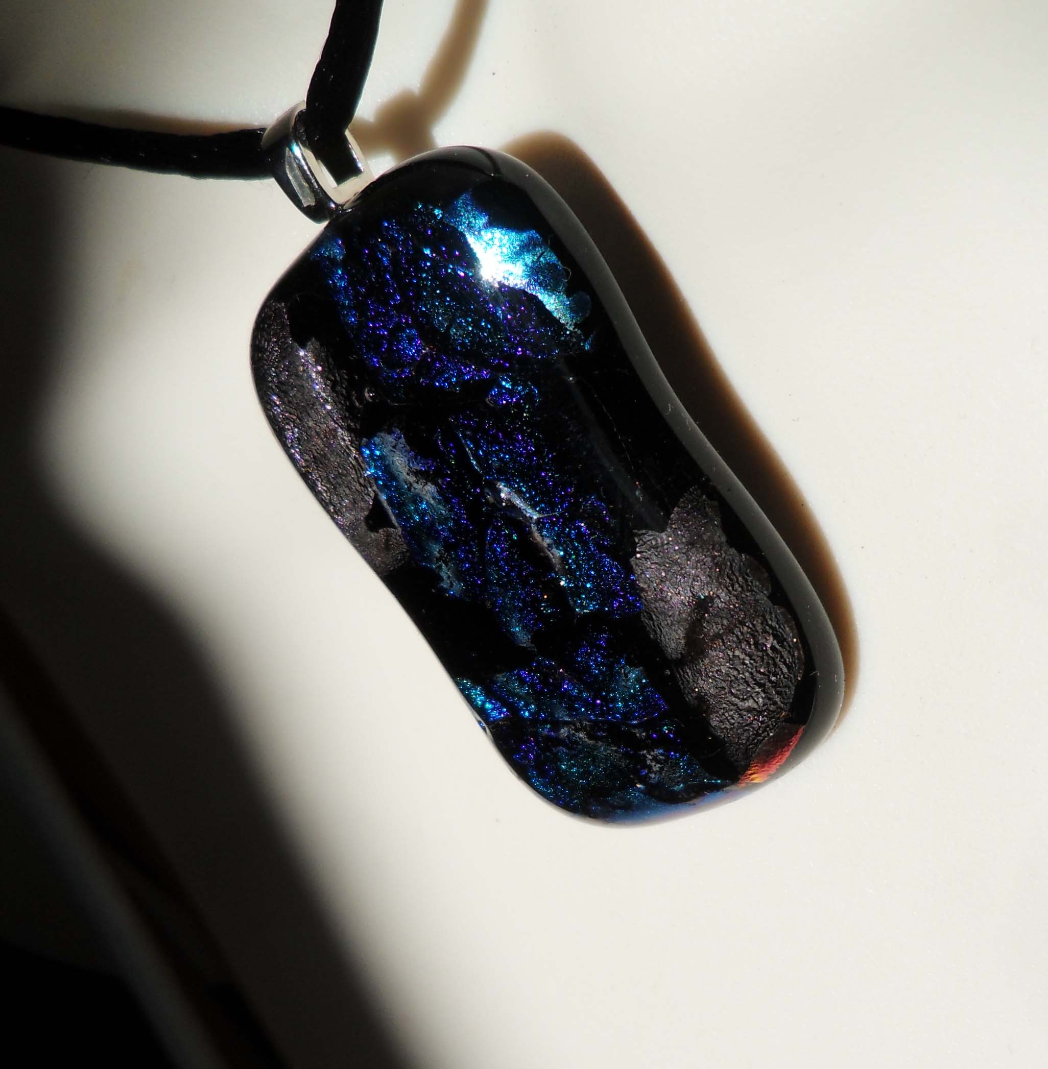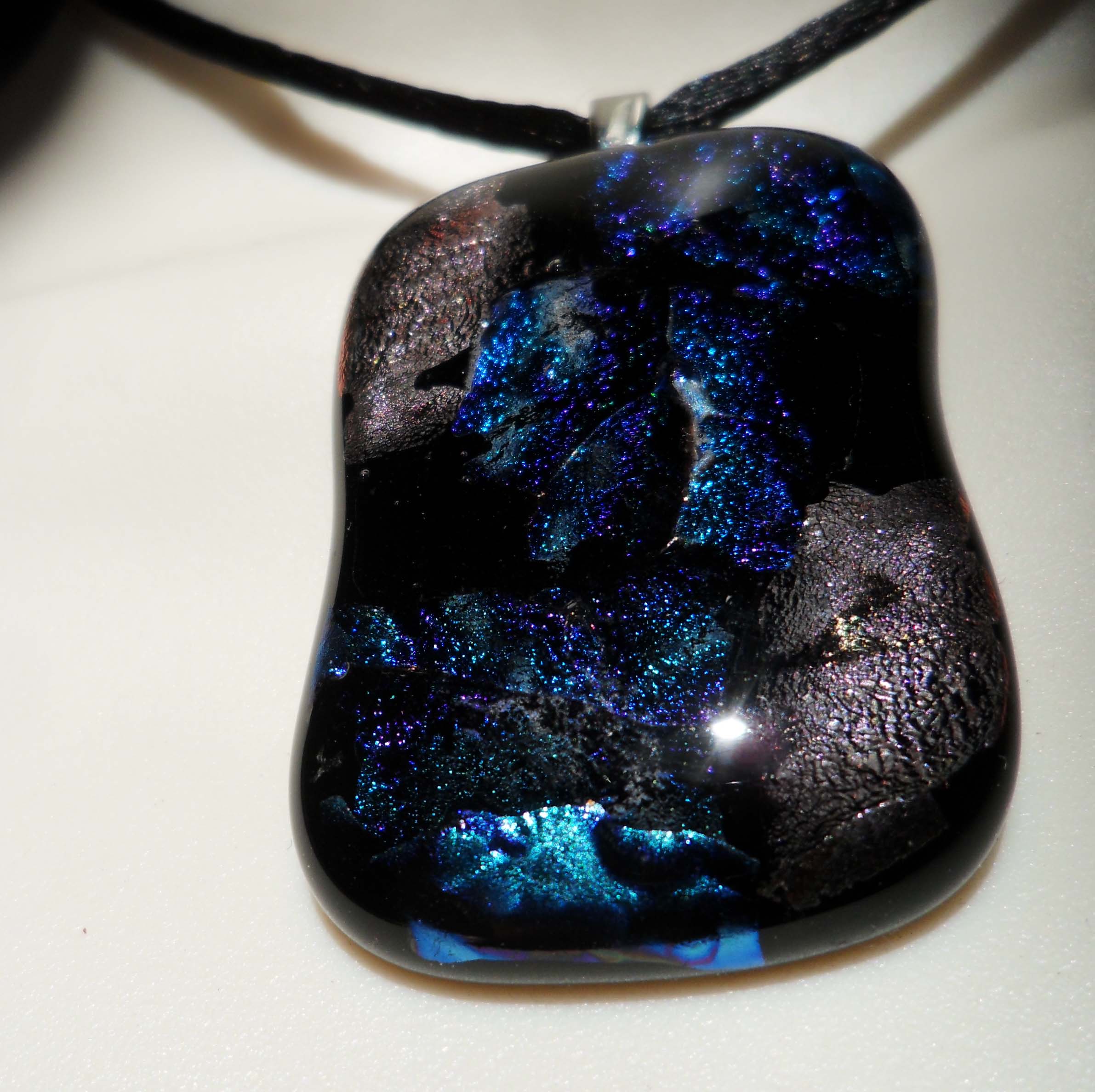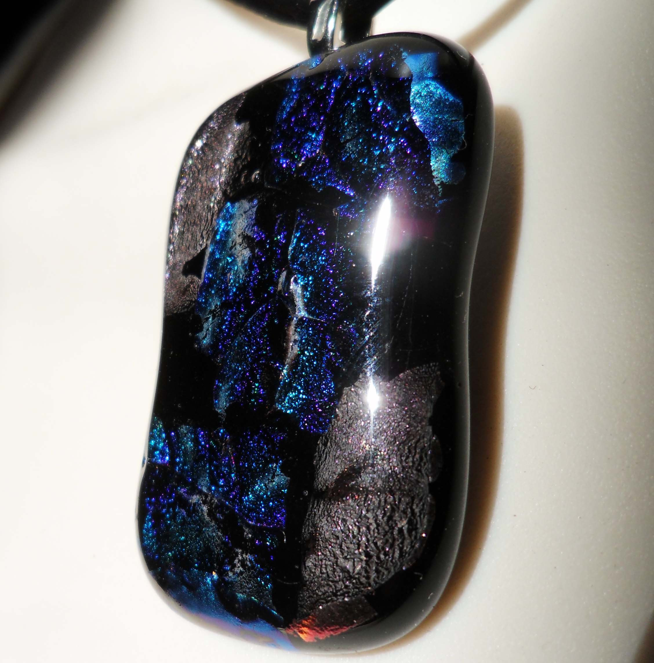 This pendant is made from fused solid black, clear and dichroic glass. The dichroic glass is what gives the radiant, multicolored look to the pendants. Each pendant is unique and one of a kind.