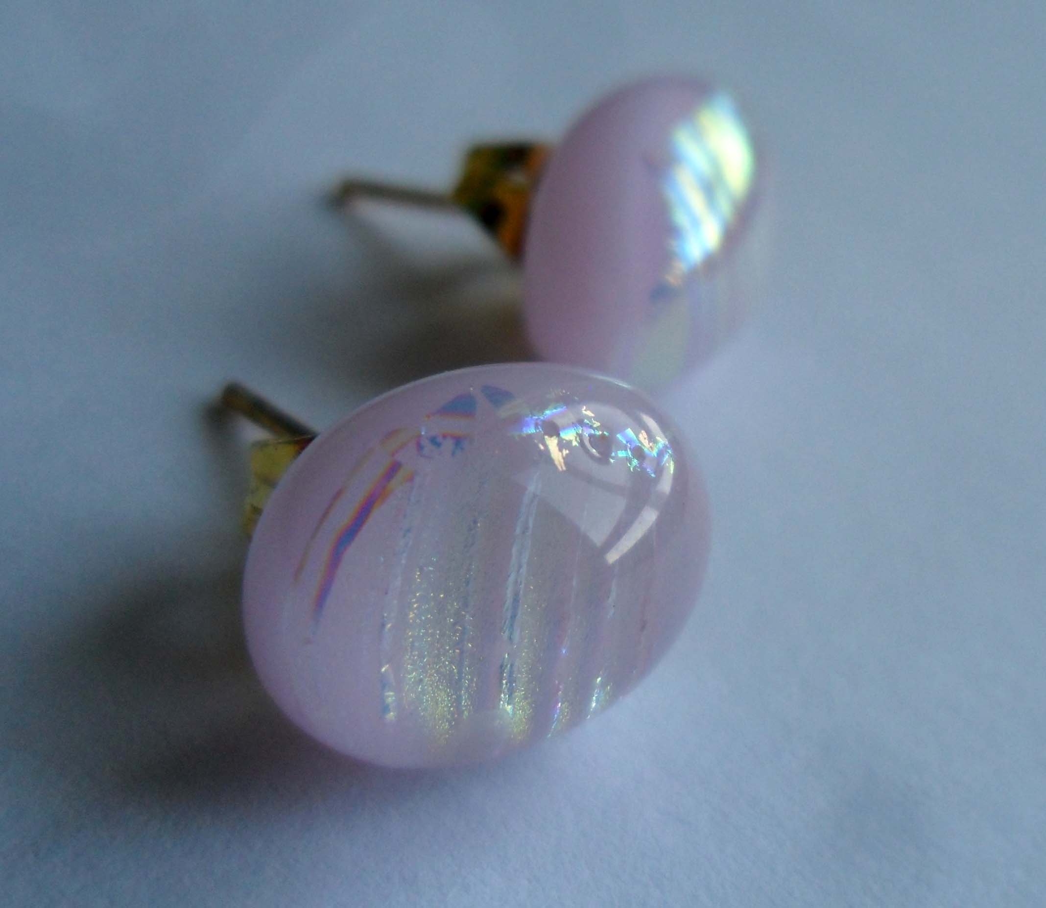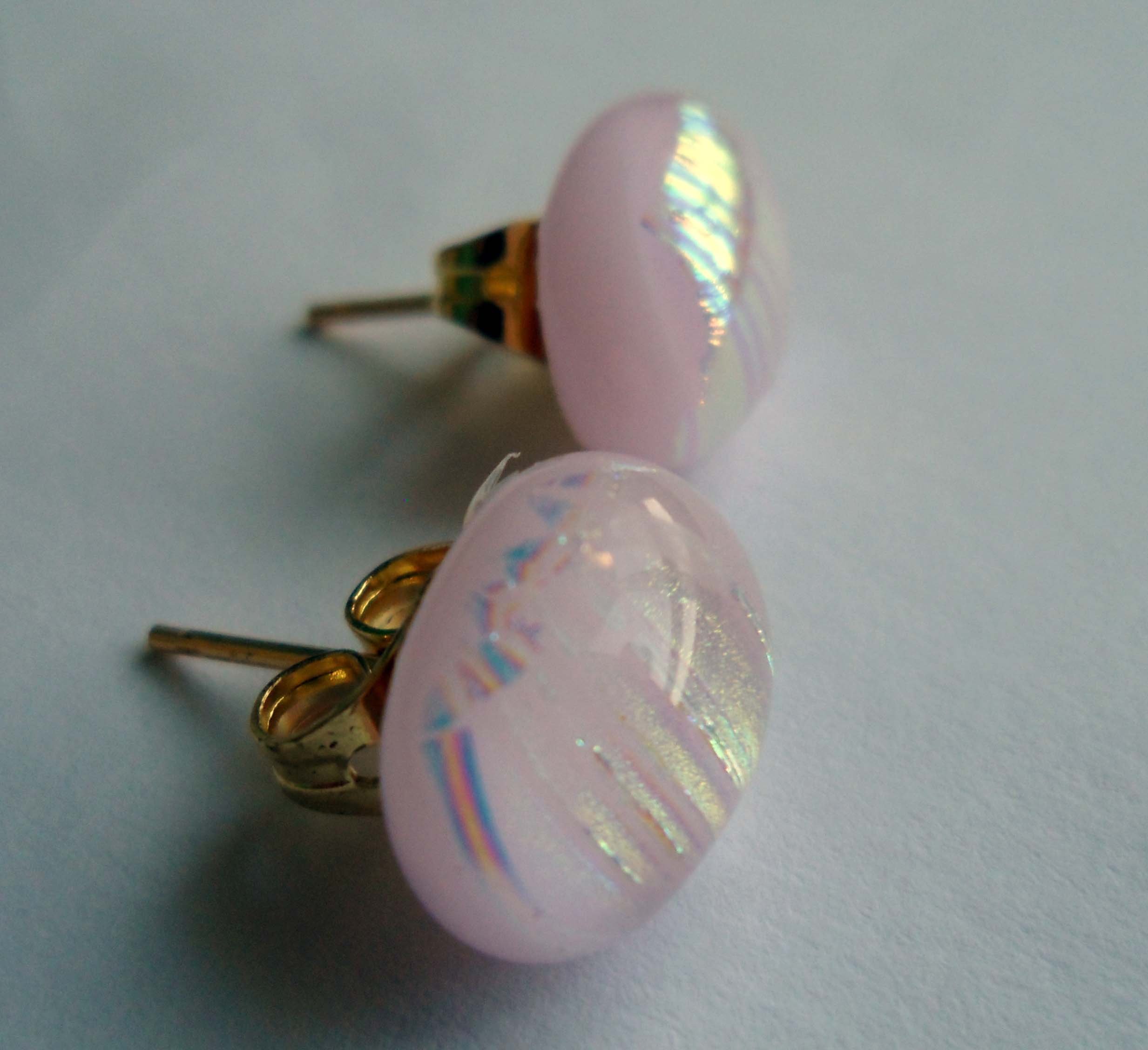 These earrings are made from fused solid pale pink, clear and dichroic glass, each pair individually designed one at a time and fired in the kiln in my studio then mounted on hypoallergenic metal for pierced ears. The dichroic glass is what gives the radiant, multicolored look to the earrings. Each pair is unique and one of a kind.