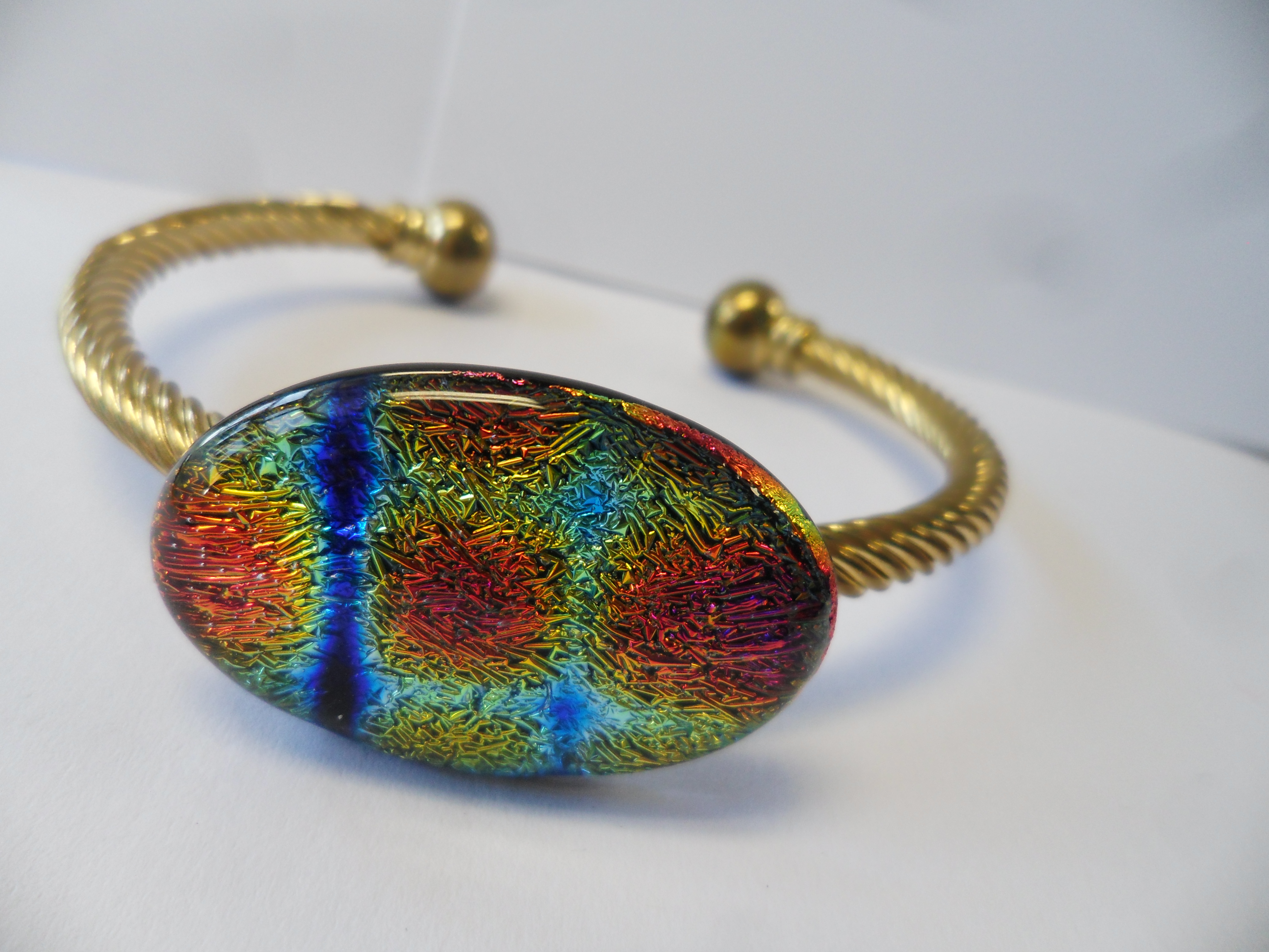 This bracelet is made from fused solid black, clear and dichroic glass. The dichroic glass is what gives the radiant, multicolored look to the pendants. Each pendant is unique and one of a kind.