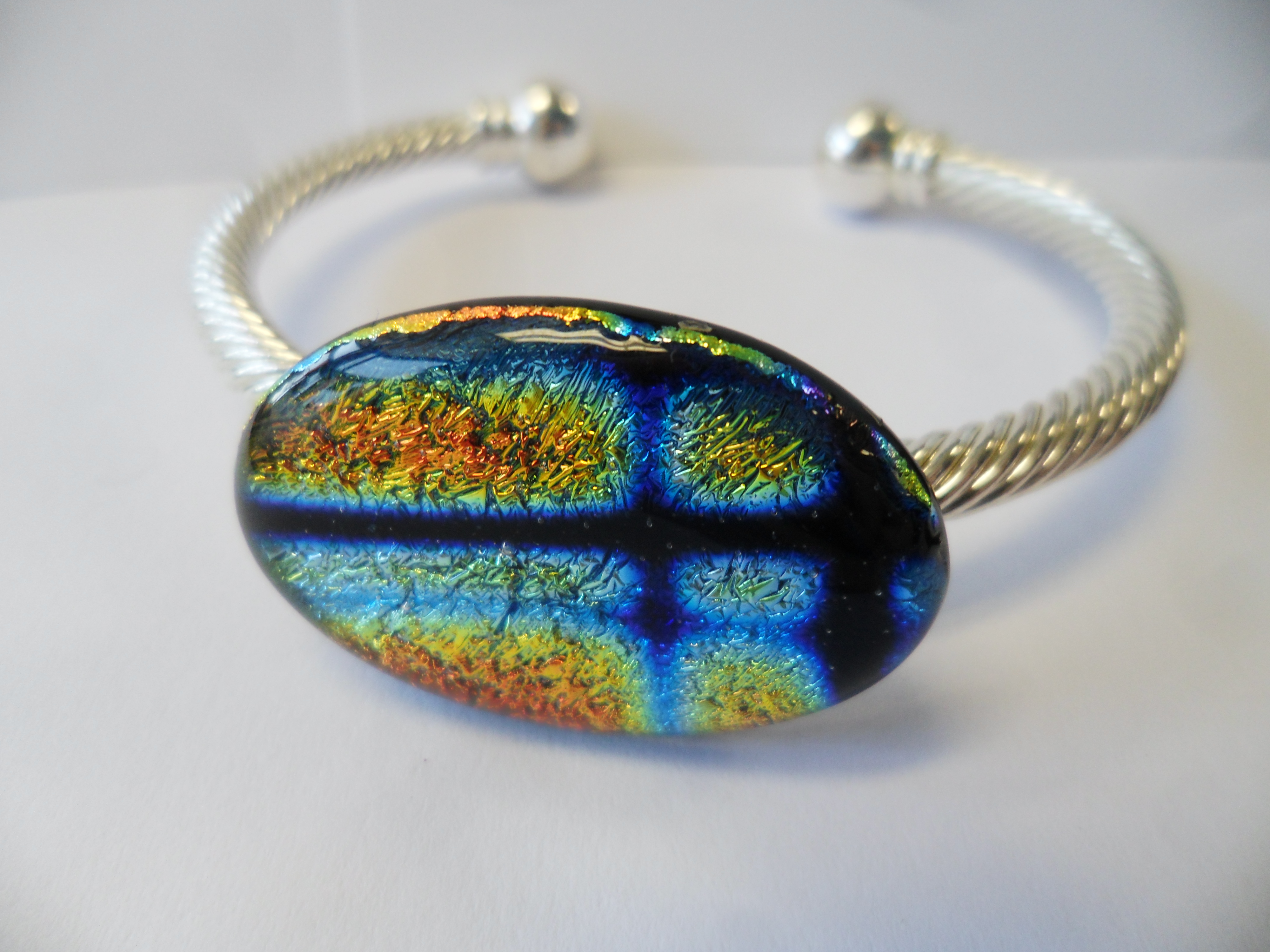 This bracelet is made from fused solid black, clear and dichroic glass. The dichroic glass is what gives the radiant, multicolored look to the pendants. Each bracelet is unique and one of a kind.