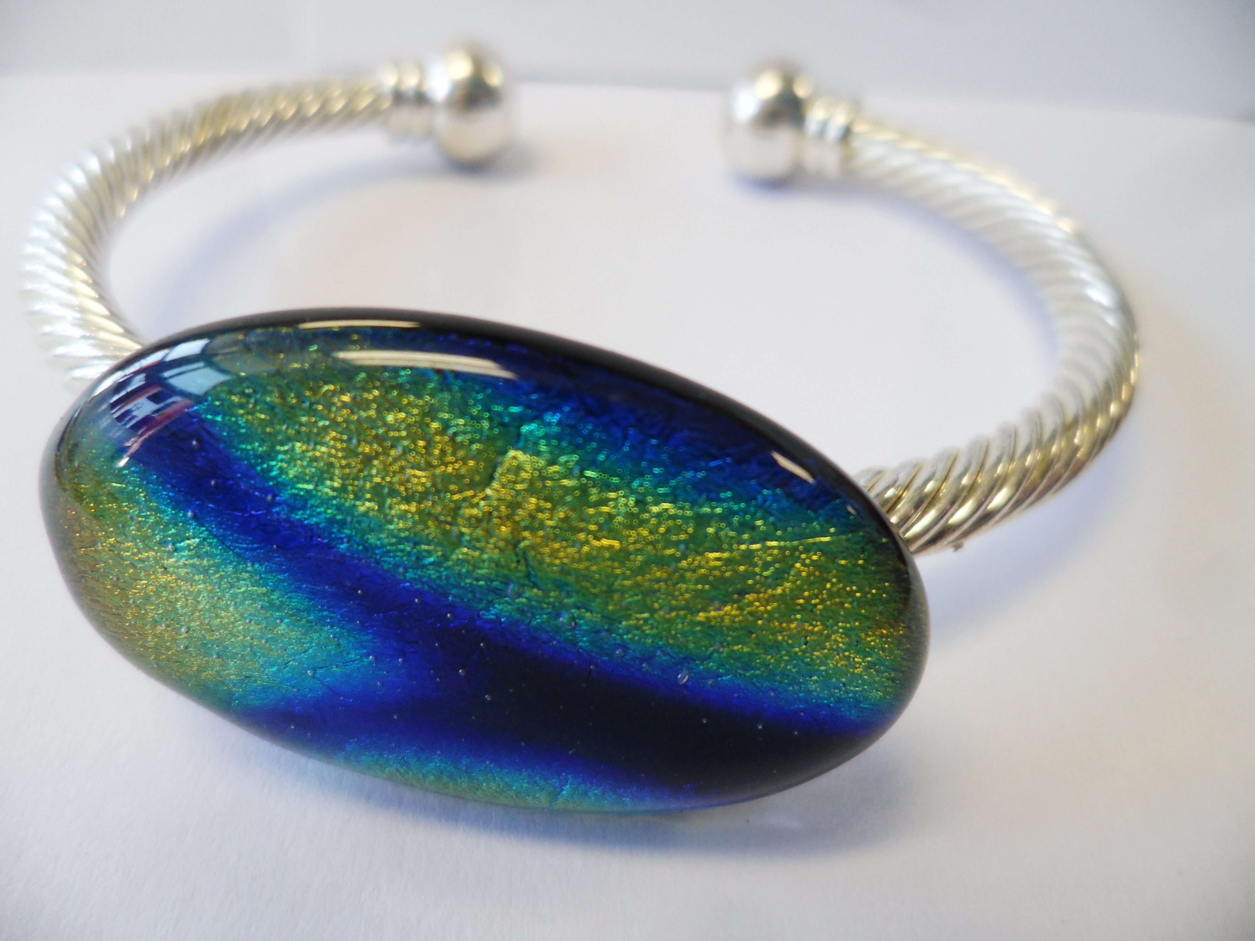This bracelet is made from fused solid black, clear and dichroic glass. The dichroic glass is what gives the radiant, multicolored look to the pendants. Each pendant is unique and one of a kind.
