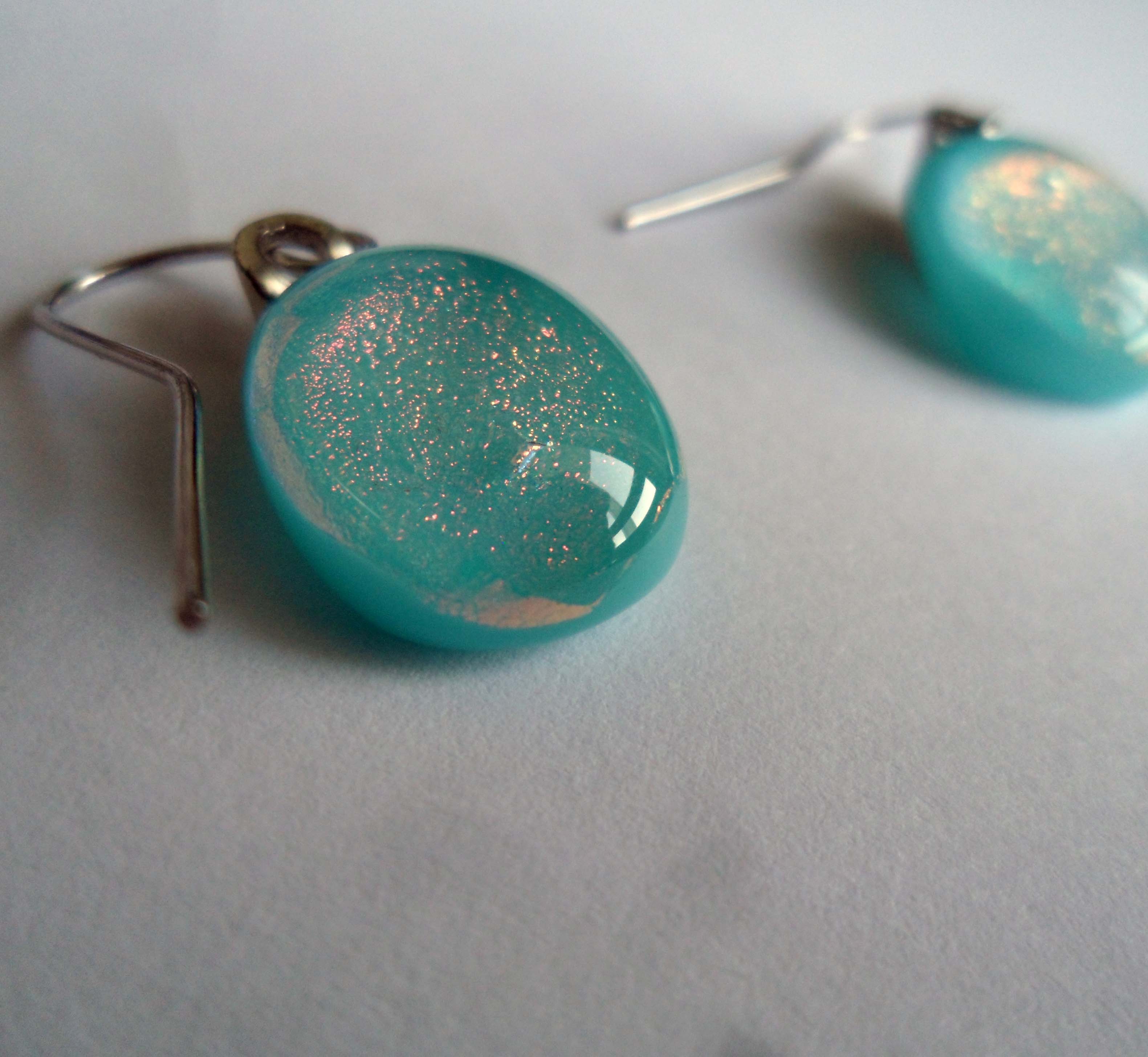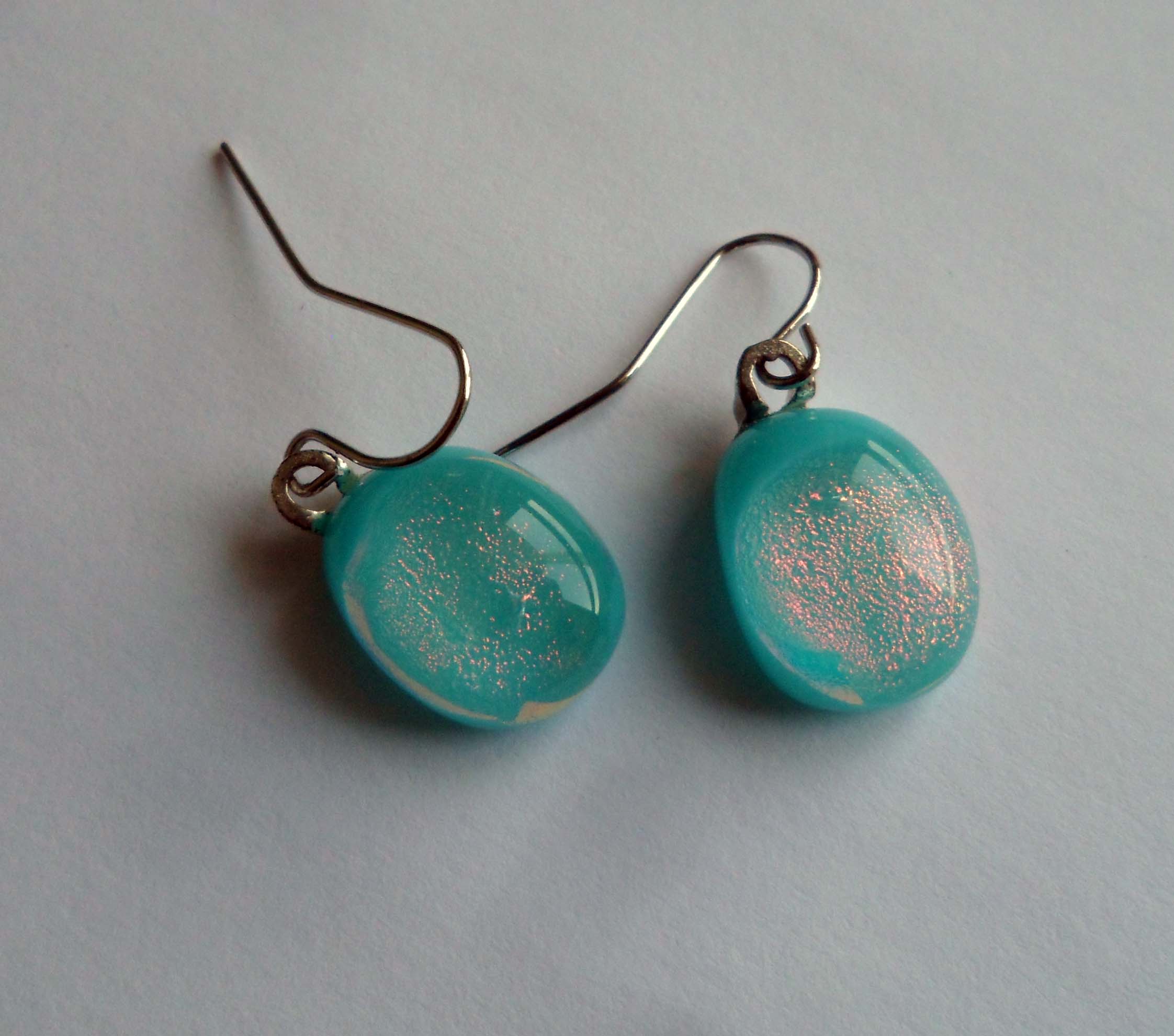 These earrings are made from fused solid pale blue, clear and dichroic glass, each pair individually designed one at a time and fired in the kiln in my studio then mounted on hypoallergenic metal for pierced ears. The dichroic glass is what gives the radiant, multicolored look to the earrings. Each pair is unique and one of a kind.